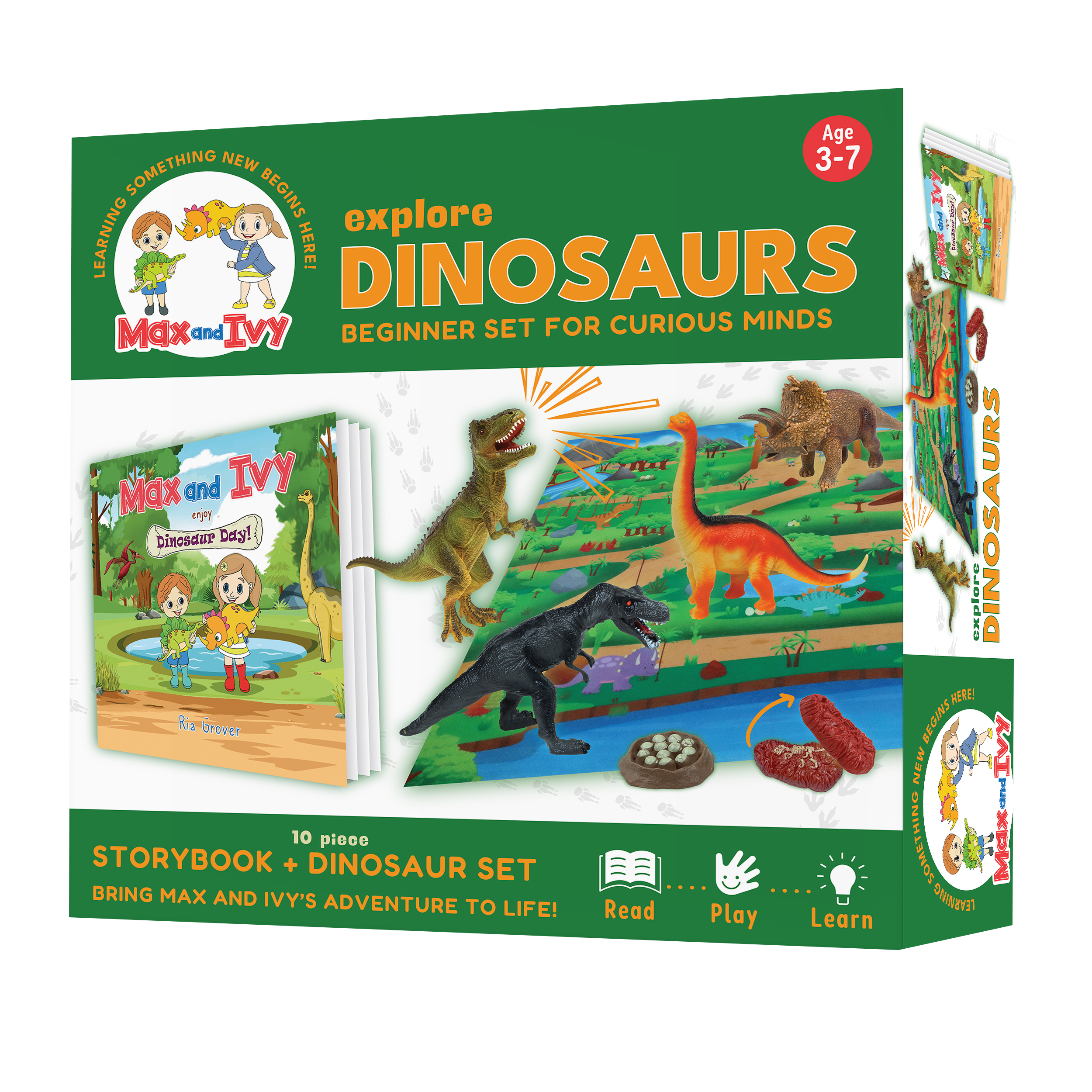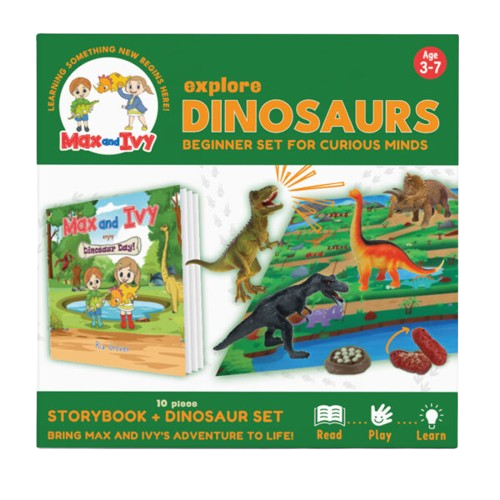 Max and Ivy explore Dinosaurs is a beginner set for children aged 3–7, based on the Read, Play, Learn concept. The beautifully illustrated storybook follows Max and Ivy as they learn about dinosaurs, while the accompanying dinosaur figures and fossils bring the story to life through hands-on play.